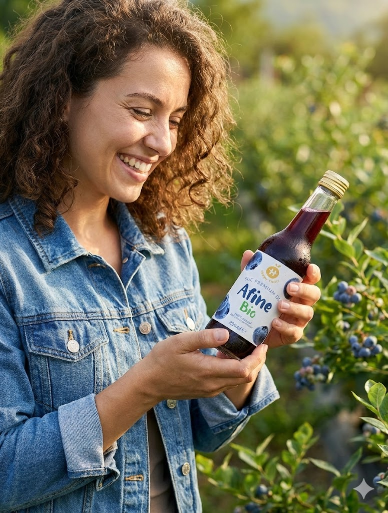 100% Natural & BIO: Fără adaos de zahăr, fără apă adăugată, fără conservanți, fără coloranți. Doar afine organice, certificate. Ingrediente: 100% suc de afine din agricultură ecologică.